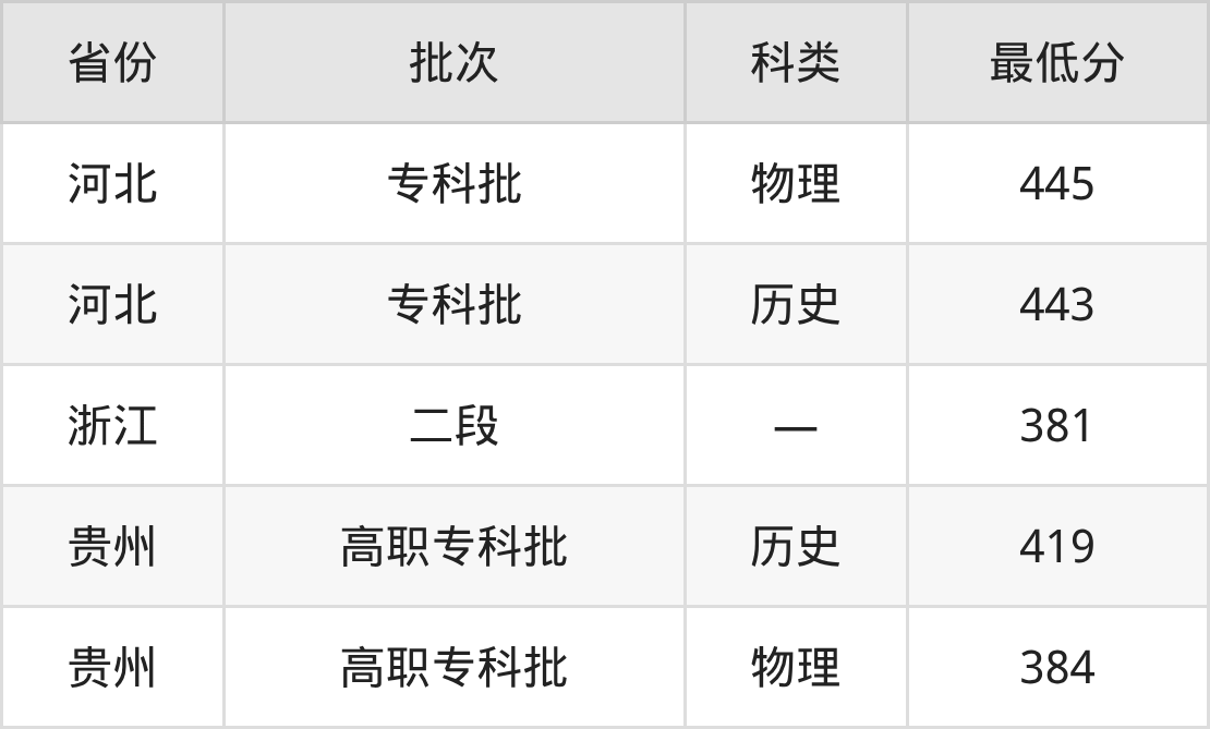 长江工程职业技术学院工业机器人技术专业在全国各省最低录取分数线为381分(浙江),除此之外,在其余地区的最低分为贵州物理类384分、河北历史类443分,以上数据均为2025年数据,供2026年高考生参考。