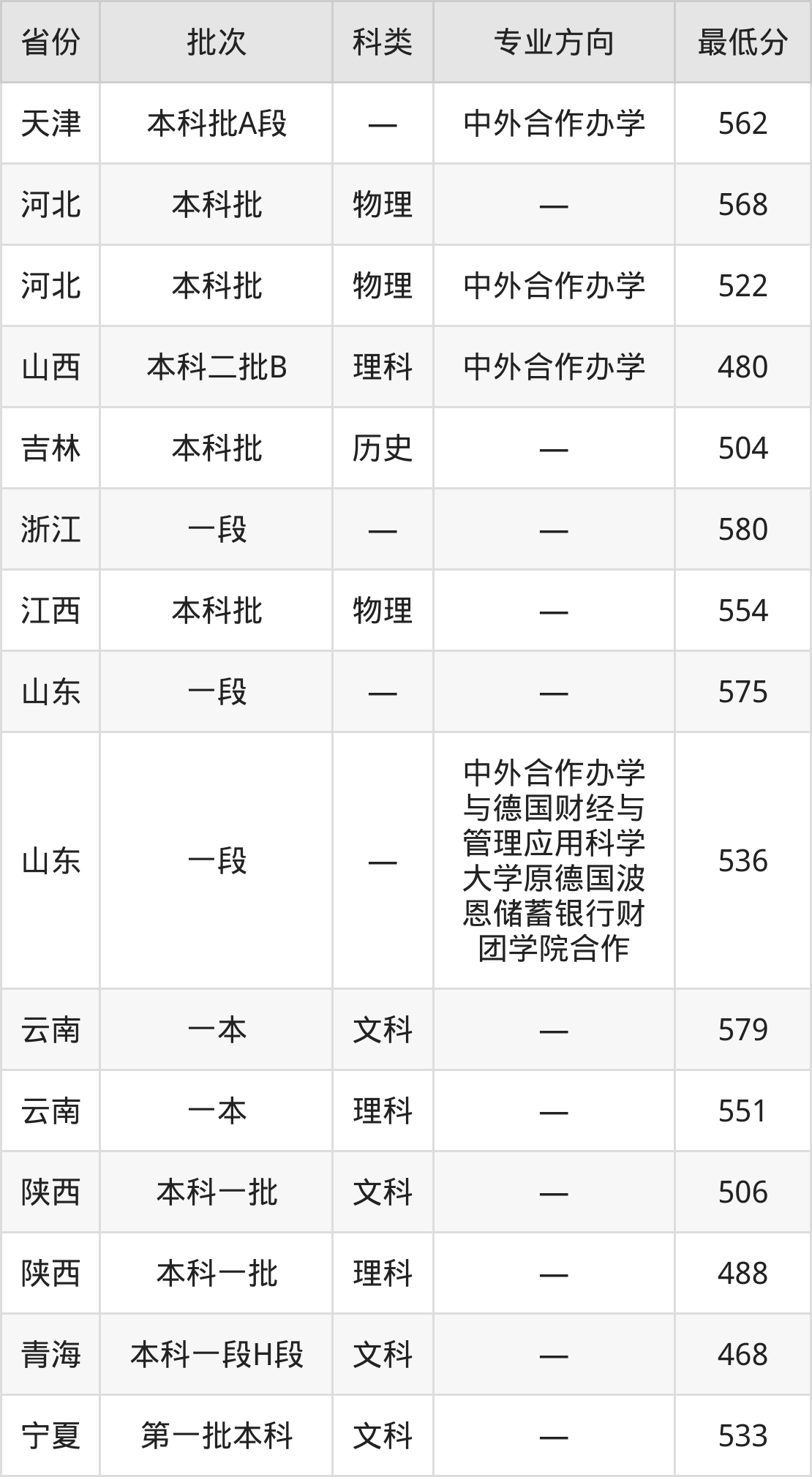 西安财经大学金融学专业在全国各省录取分数线: