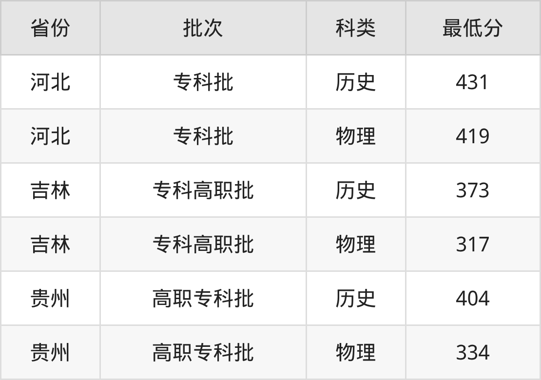 吉安职业技术学院护理专业在全国各省最低录取分数线为317分(吉林物理类),除此之外,在其余地区的最低分为河北物理类419分、贵州物理类334分,以上数据均为2025年数据,供2026年高考生参考。