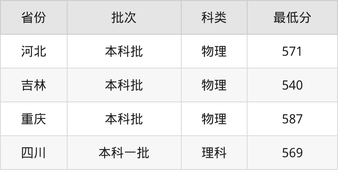 河北大学临床医学专业在全国各省最低录取分数线为540分(吉林物理类),除此之外,在其余地区的最低分为河北物理类571分、重庆物理类587分、四川理科569分,以上数据均为2024年数据,供2025年高考生参考。