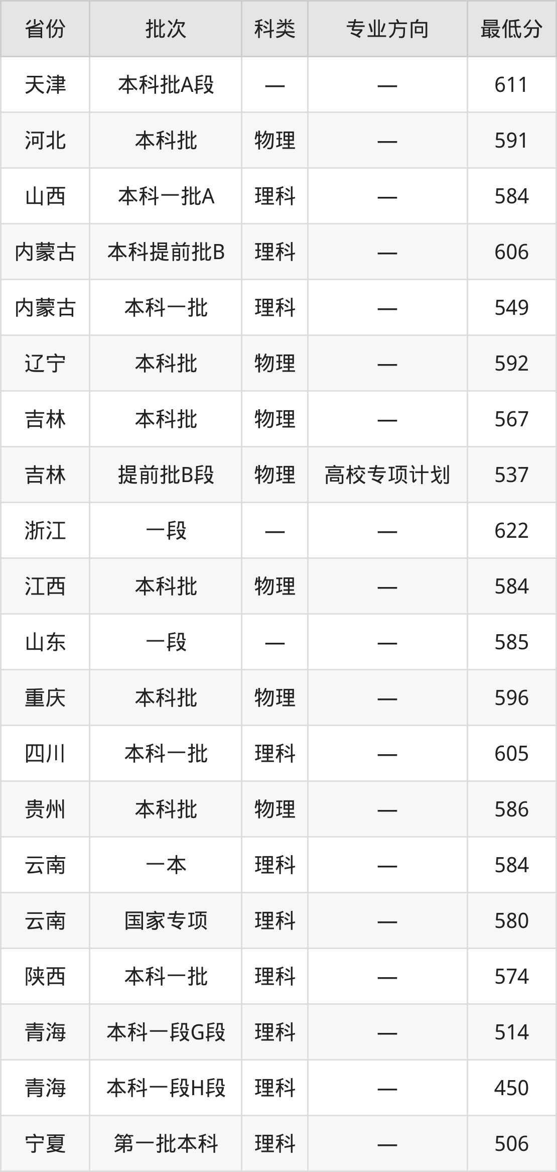 中国地质大学(北京)地质学类专业录取分数线从450分到622分不等,在部分地区的最低分数线如下: