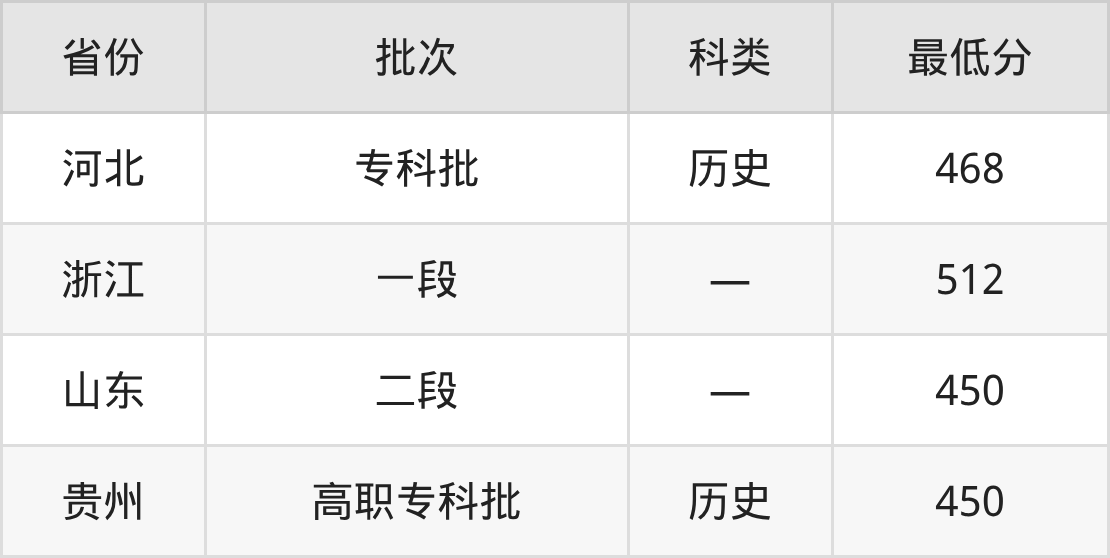 上海城建职业学院智慧健康养老服务与管理专业在全国各省最低录取分数线为450分(山东),除此之外,在其余地区的最低分为河北历史类468分、浙江512分、贵州历史类450分,以上数据均为2025年数据,供2026年高考生参考。