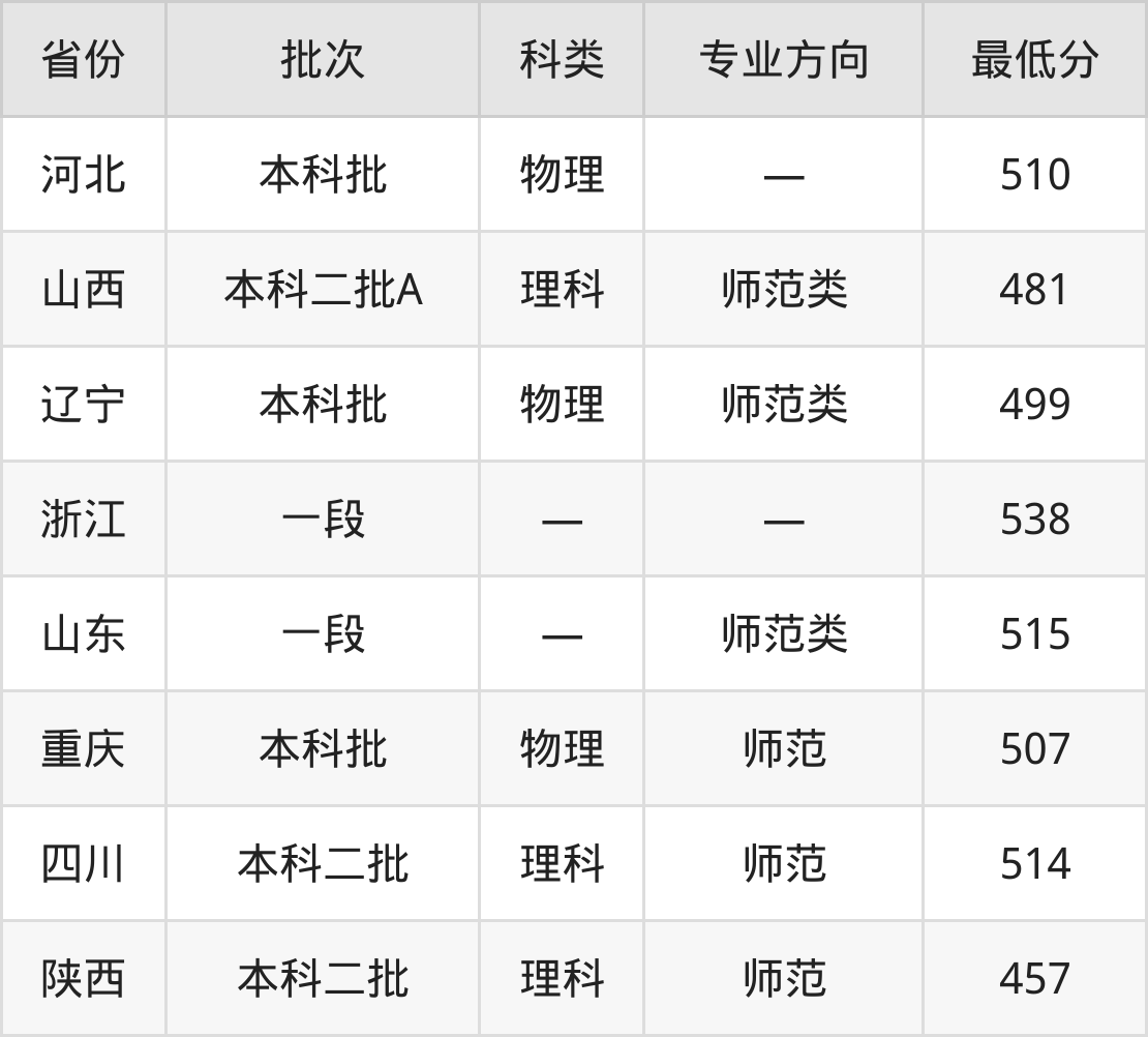 宝鸡文理学院地理科学专业在全国各省最低录取分数线为457分(陕西理科),除此之外,在其余地区的最低分为河北物理类510分、山西理科481分、辽宁物理类499分、浙江538分等,以上数据均为2024年数据,供2025年高考生参考。
