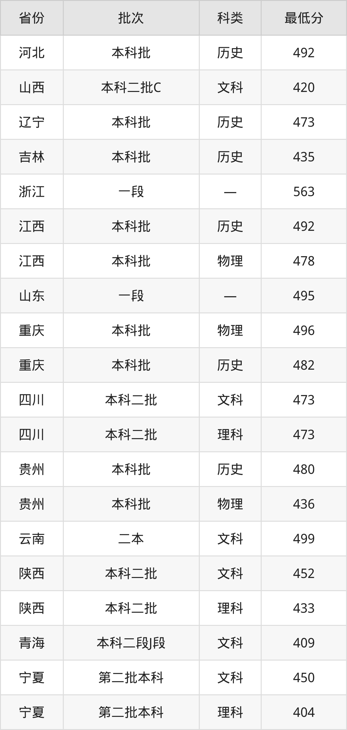 成都外国语学院网络与新媒体专业录取分数线从404分到563分不等,在部分地区的最低分数线如下: