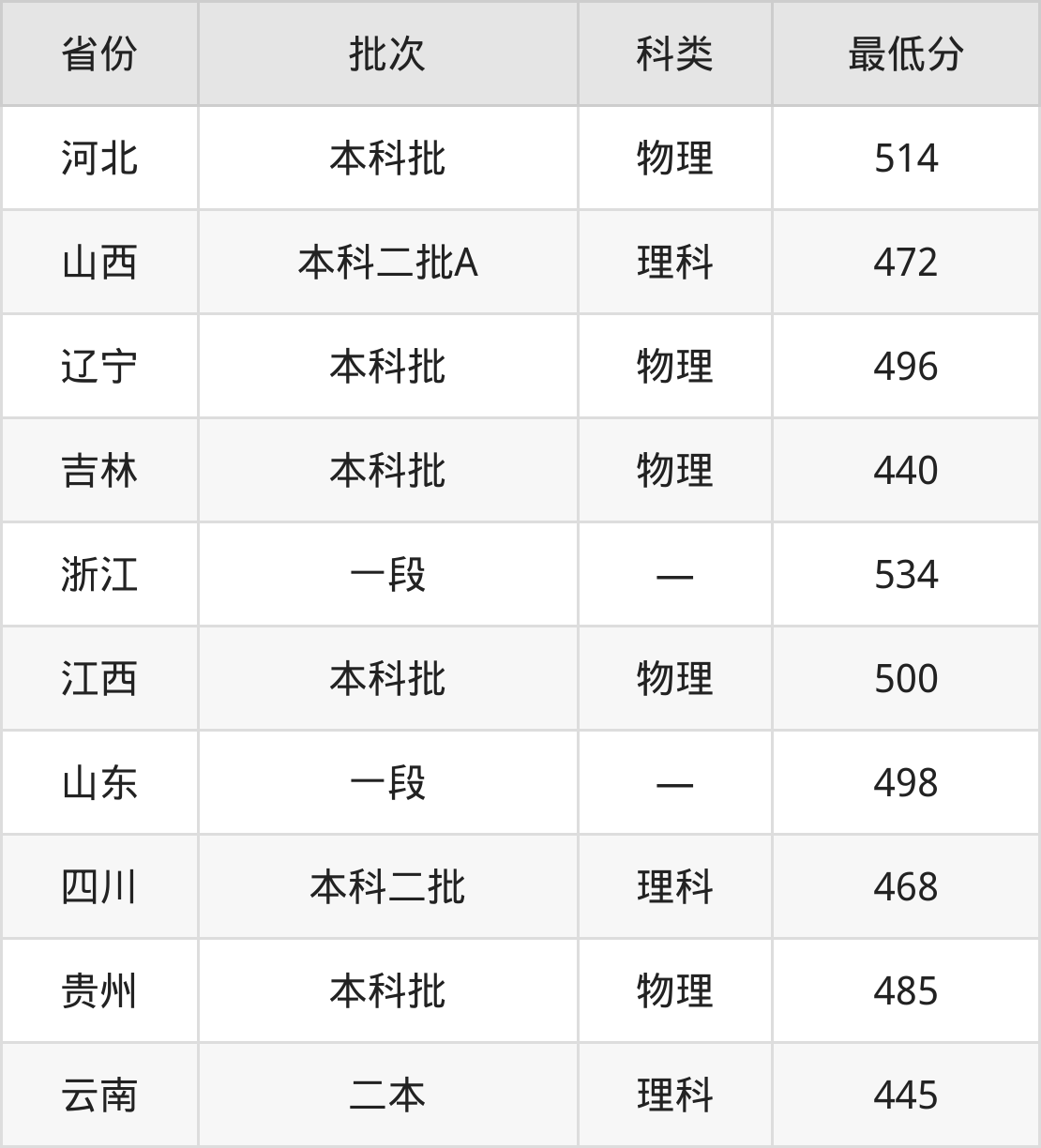 吉林医药学院康复治疗学专业在全国各省最低录取分数线为440分(吉林物理类),除此之外,在其余地区的最低分为山西理科472分、浙江534分、山东498分、云南理科445分等,以上数据均为2024年数据,供2025年高考生参考。