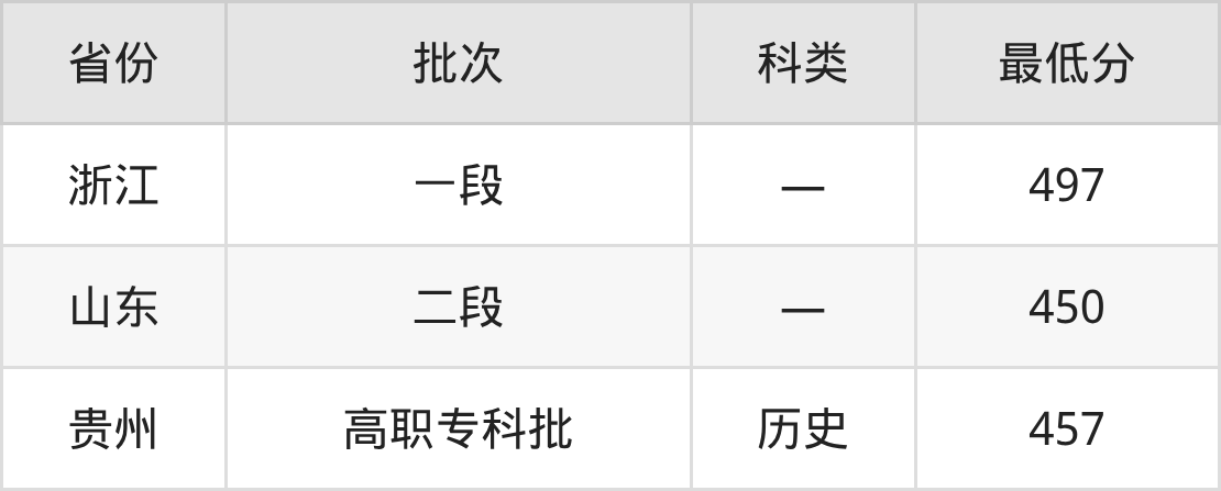 湖南司法警官职业学院法律事务专业在全国各省最低录取分数线为450分(山东),除此之外,在其余地区的最低分为浙江497分、贵州历史类457分,以上数据均为2025年数据,供2026年高考生参考。