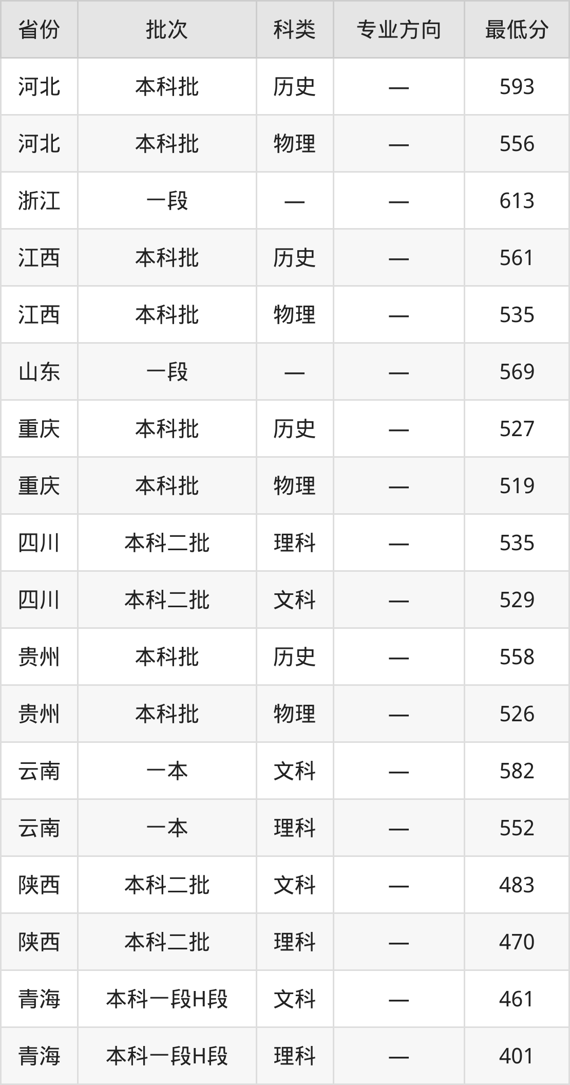 四川外国语大学新闻传播学类专业在全国各省最低录取分数线为401分(青海理科),除此之外,在其余地区的最低分为浙江613分、江西物理类535分、山东569分、贵州物理类526分等,以上数据均为2024年数据,供2025年高考生参考。