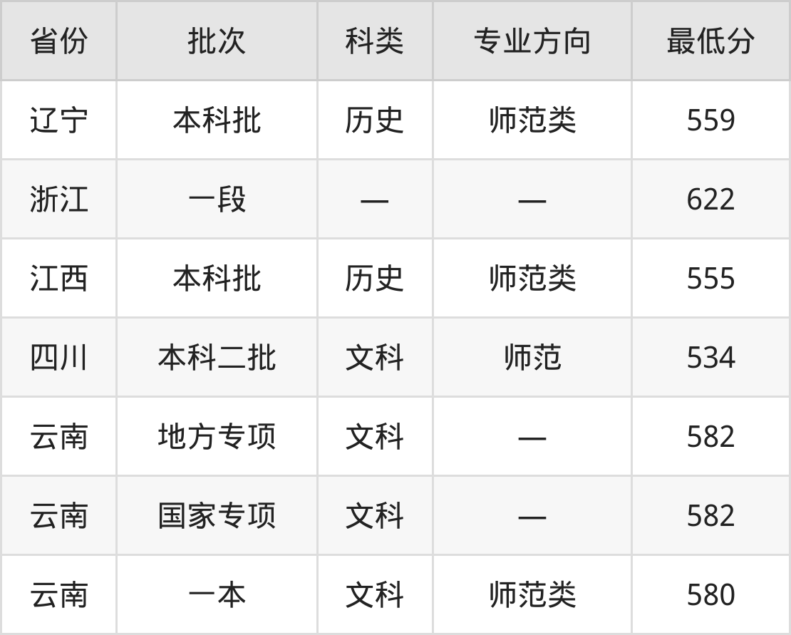 云南师范大学历史学专业在全国各省最低录取分数线为534分(四川文科),除此之外,在其余地区的最低分为江西历史类555分、云南文科580分、辽宁历史类559分、浙江622分,以上数据均为2024年数据,供2025年高考生参考。