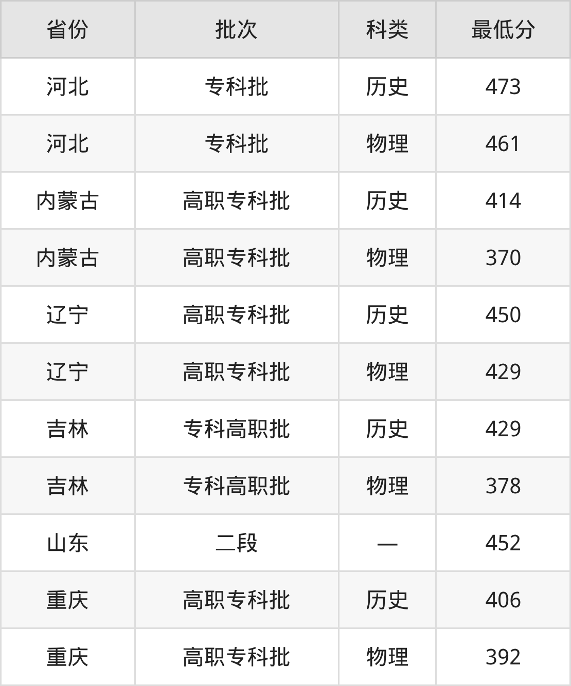 黑龙江交通职业技术学院动车组检修技术专业在全国各省最低录取分数线为370分(内蒙古物理类),除此之外,在其余地区的最低分为河北物理类461分、辽宁物理类429分、吉林物理类378分、山东452分等,以上数据均为2025年数据,供2026年高考生参考。