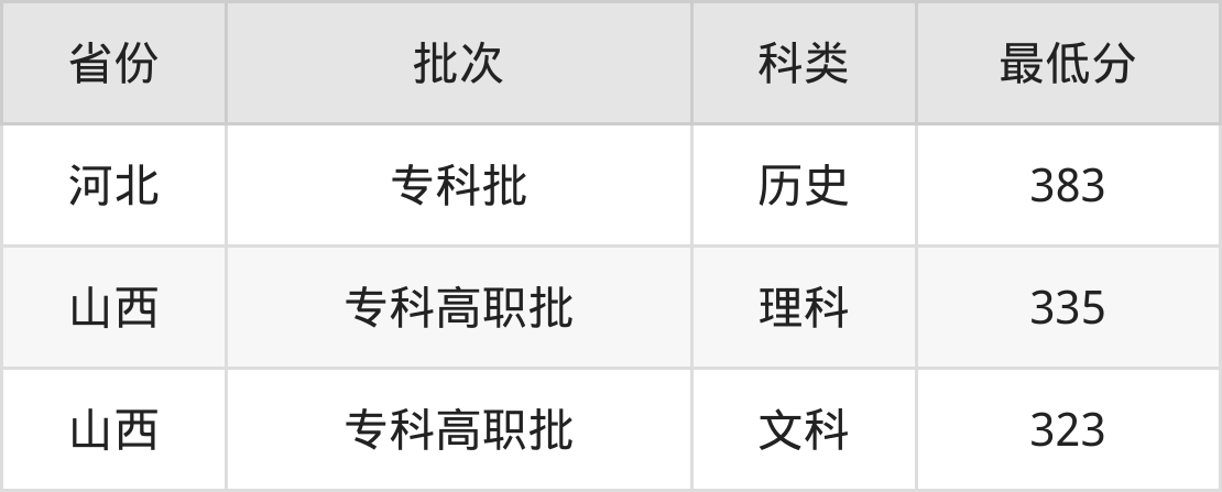 山西机电职业技术学院工业机器人技术专业录取分数线从323分到383分不等,最低分数线如下: