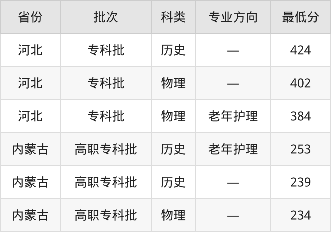 锡林郭勒职业学院护理专业录取分数线从234分到424分不等,最低分数线如下: