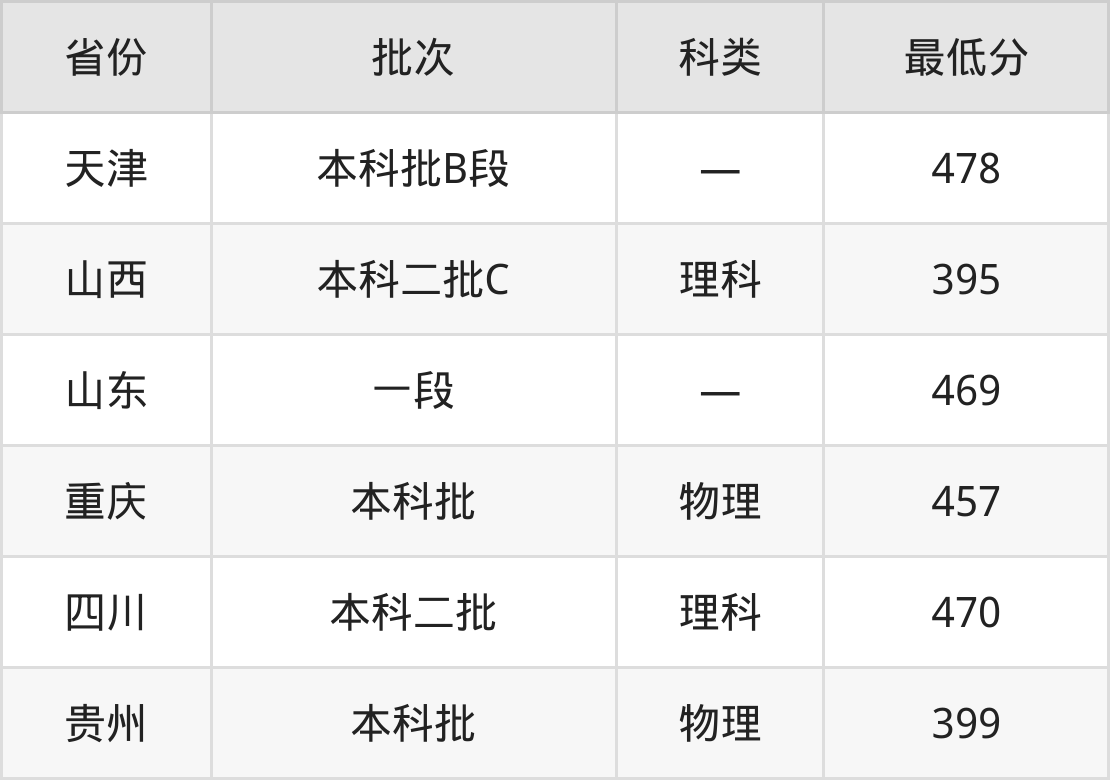 青岛工学院工程管理专业在全国各省最低录取分数线为395分(山西理科),除此之外,在其余地区的最低分为贵州物理类399分、天津478分、山东469分、重庆物理类457分等,以上数据均为2024年数据,供2025年高考生参考。