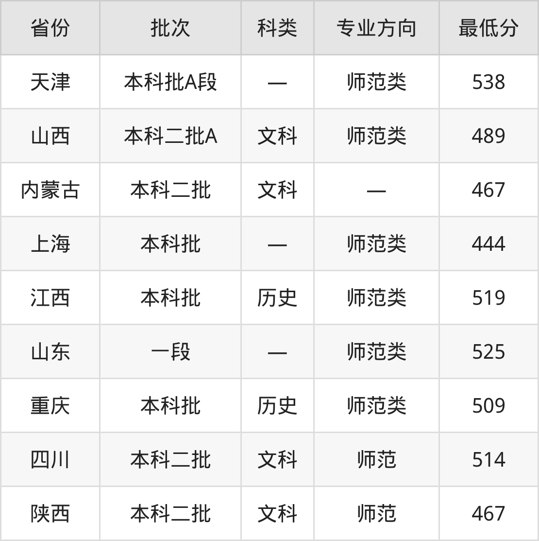 忻州师范学院汉语言文学专业在全国各省录取分数线: