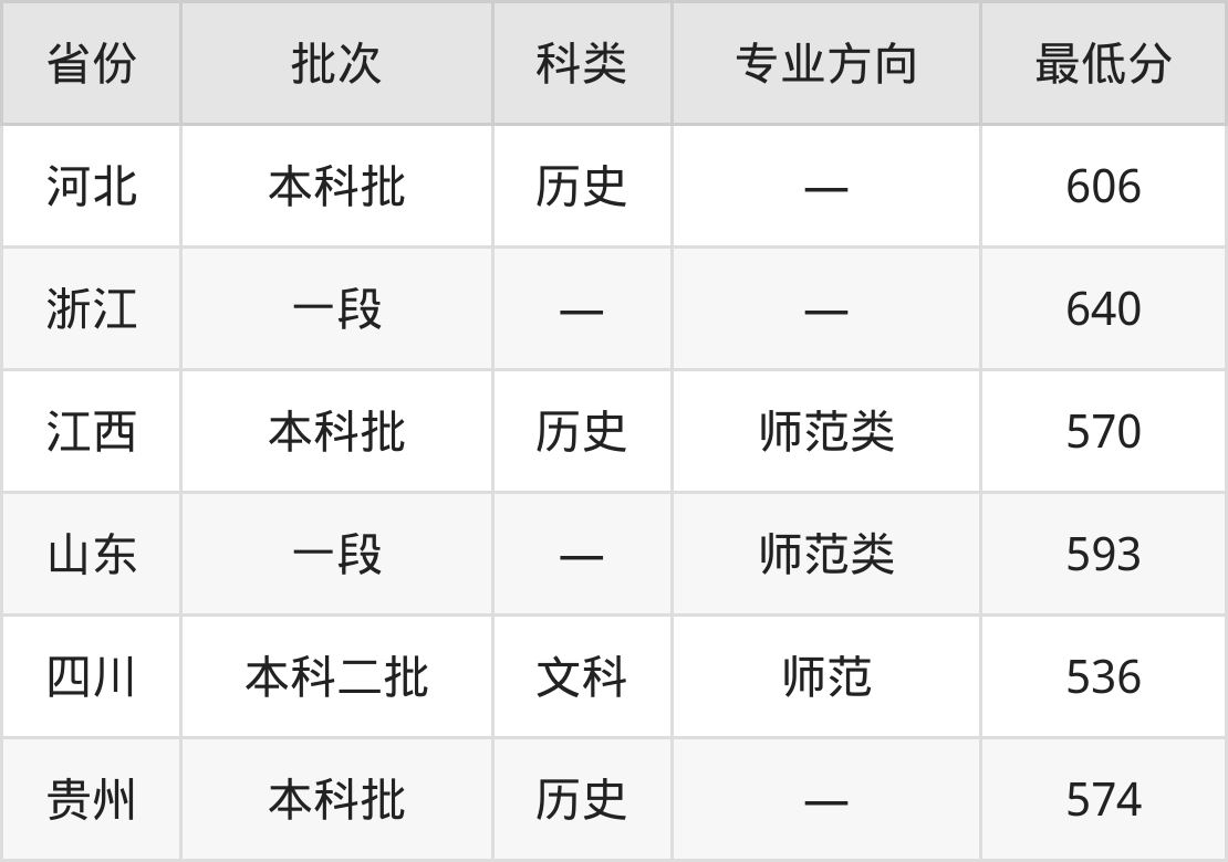 江苏师范大学汉语言文学专业在全国各省最低录取分数线为536分(四川文科),除此之外,在其余地区的最低分为浙江640分、江西历史类570分、山东593分、贵州历史类574分等,以上数据均为2024年数据,供2025年高考生参考。