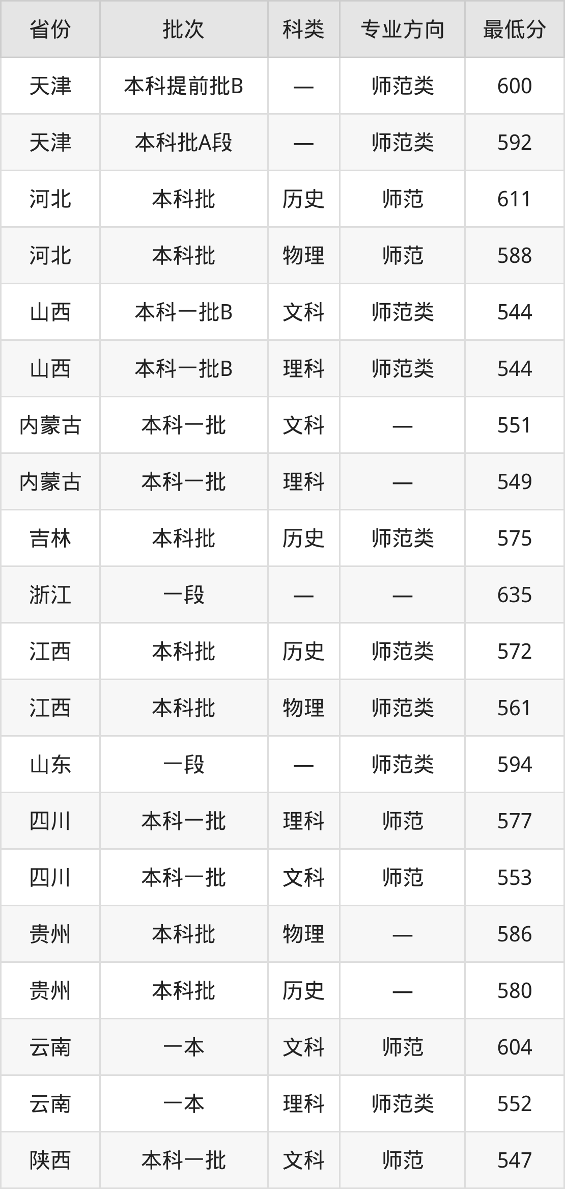 天津师范大学汉语言文学专业录取分数线从479分到635分不等,在部分地区的最低分数线如下: