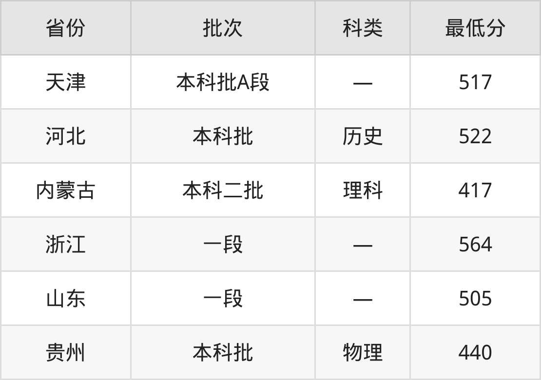 牡丹江师范学院工商管理专业在全国各省最低录取分数线为417分(内蒙古理科),除此之外,在其余地区的最低分为山东505分、贵州物理类440分、天津517分、河北历史类522分等,以上数据均为2024年数据,供2025年高考生参考。