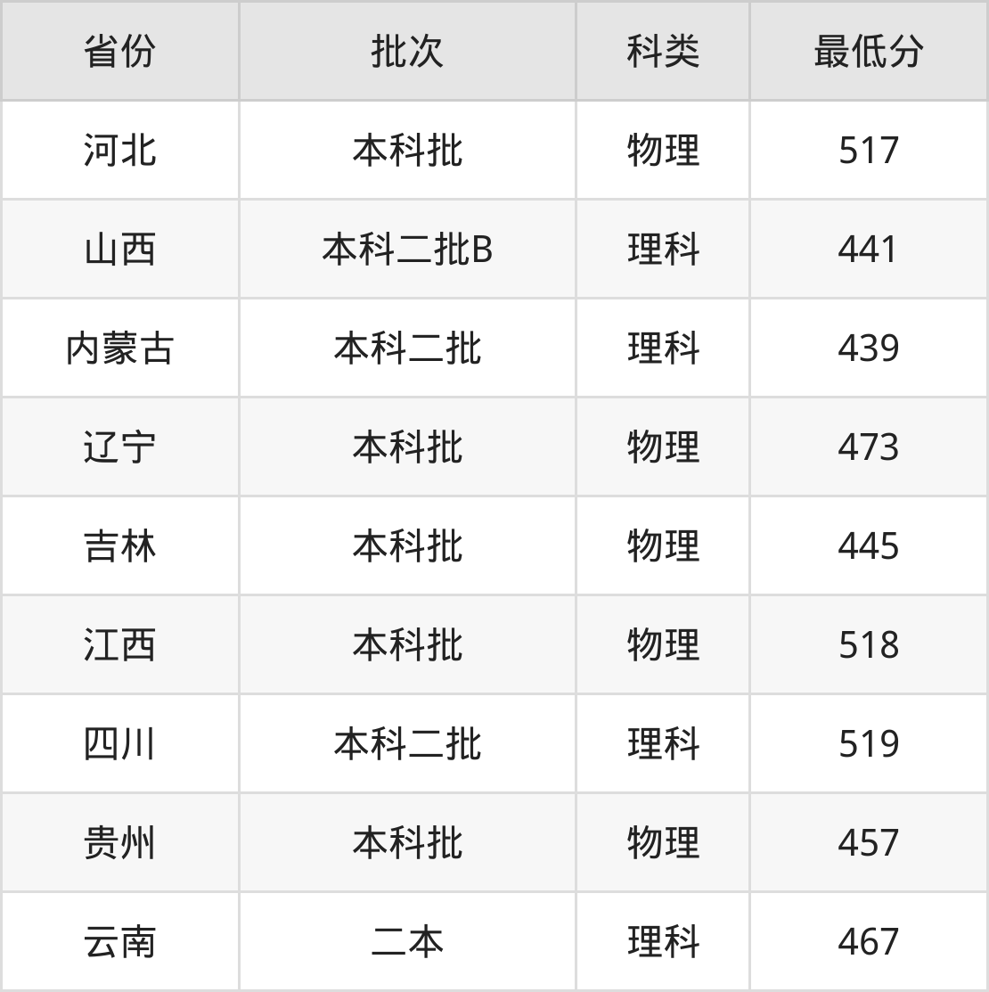 湖北工程学院食品科学与工程专业在全国各省最低录取分数线为439分(内蒙古理科),除此之外,在其余地区的最低分为四川理科519分、贵州物理类457分、辽宁物理类473分、吉林物理类445分等,以上数据均为2024年数据,供2025年高考生参考。