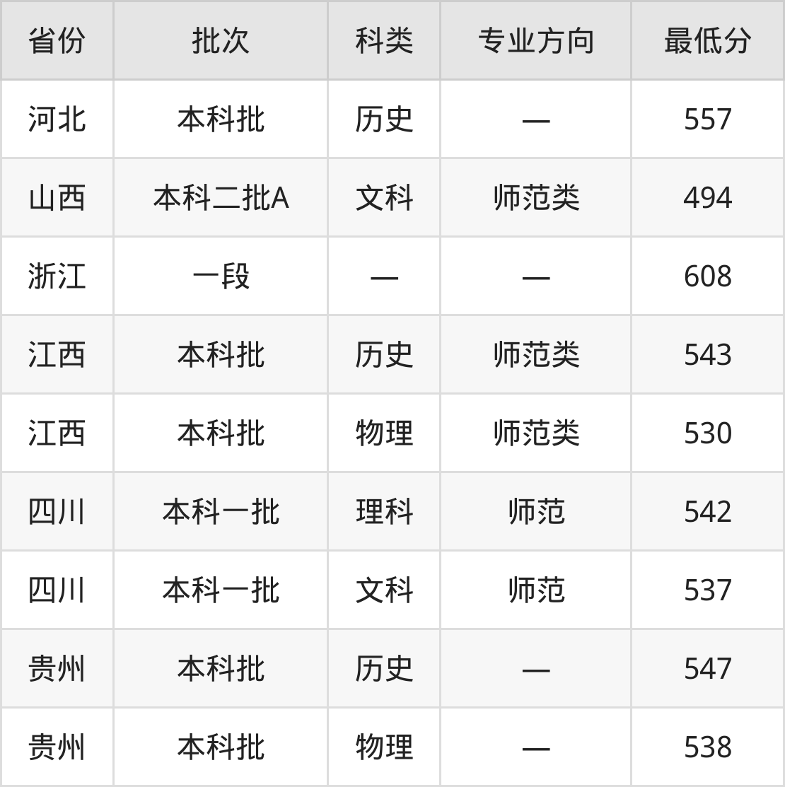 赣南师范大学英语专业录取分数线从494分到608分不等,最低分数线如下: