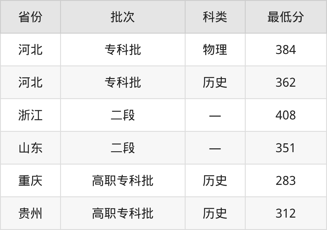 武昌职业学院机电一体化技术专业在全国各省最低录取分数线为283分(重庆历史类),除此之外,在其余地区的最低分为河北历史类362分、浙江408分、山东351分、贵州历史类312分,以上数据均为2025年数据,供2026年高考生参考。