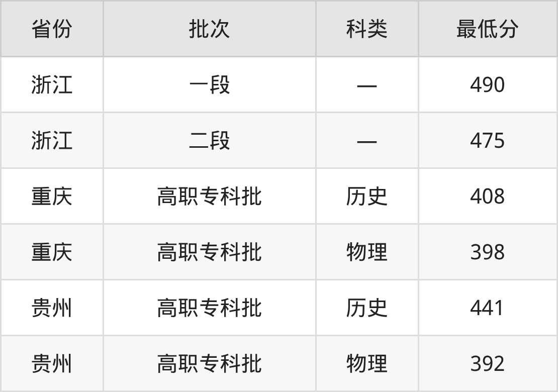 江西司法警官职业学院计算机应用技术专业在全国各省最低录取分数线为392分(贵州物理类),除此之外,在其余地区的最低分为浙江475分、重庆物理类398分,以上数据均为2025年数据,供2026年高考生参考。