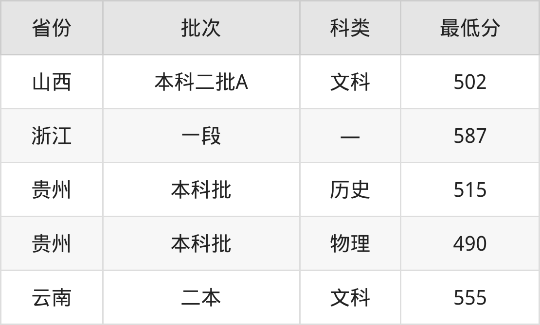 浙江外国语学院法语专业在全国各省最低录取分数线为490分(贵州物理类),除此之外,在其余地区的最低分为浙江587分、云南文科555分、山西文科502分,以上数据均为2024年数据,供2025年高考生参考。