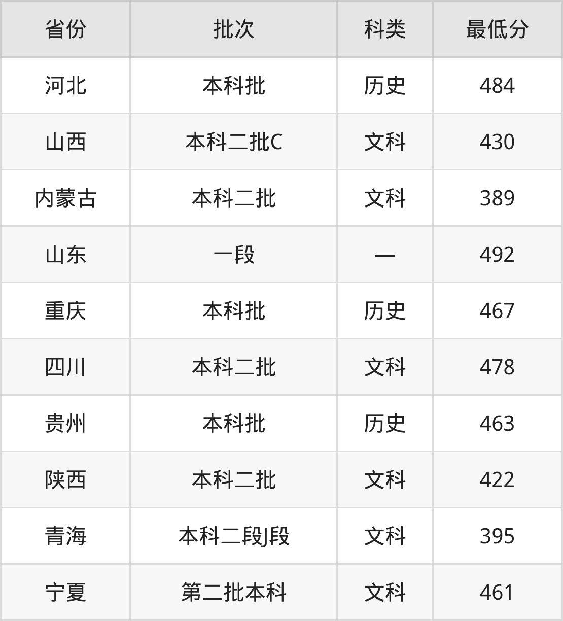 陕西国际商贸学院汉语言文学专业在全国各省最低录取分数线为389分(内蒙古文科),除此之外,在其余地区的最低分为河北历史类484分、山东492分、四川文科478分、青海文科395分等,以上数据均为2024年数据,供2025年高考生参考。