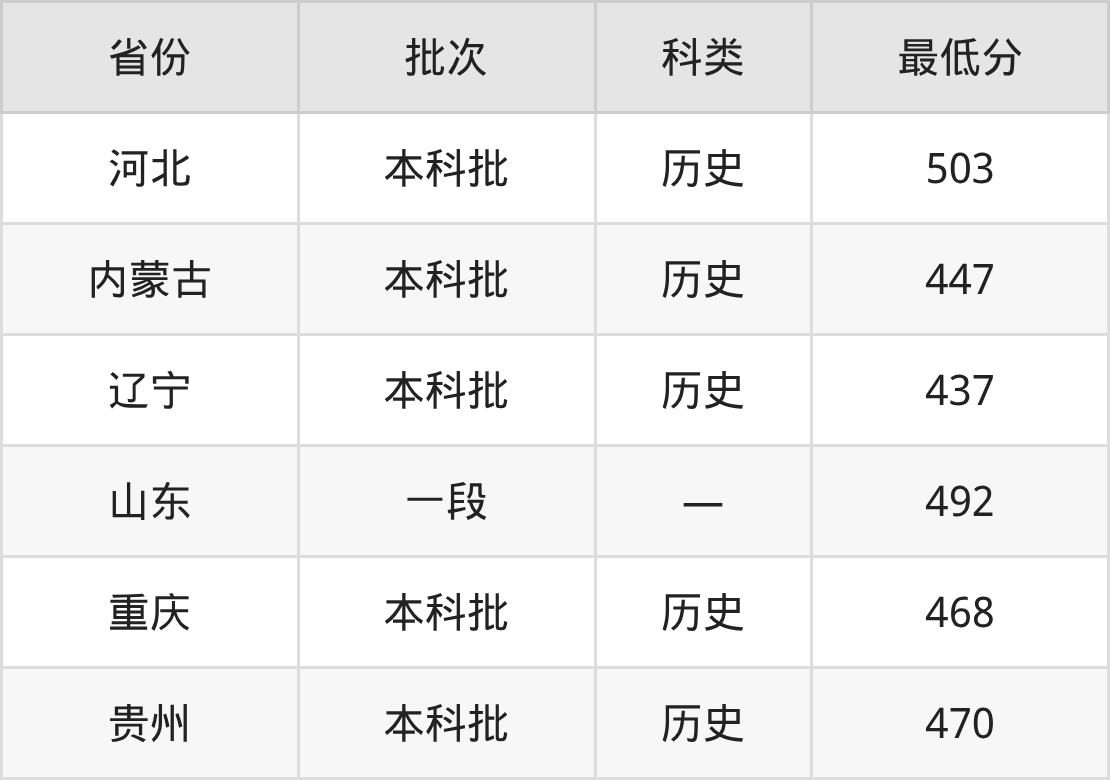 陕西国际商贸学院汉语言文学专业在全国各省最低录取分数线为437分(辽宁历史类),除此之外,在其余地区的最低分为重庆历史类468分、贵州历史类470分、河北历史类503分、内蒙古历史类447分等,以上数据均为2025年数据,供2026年高考生参考。