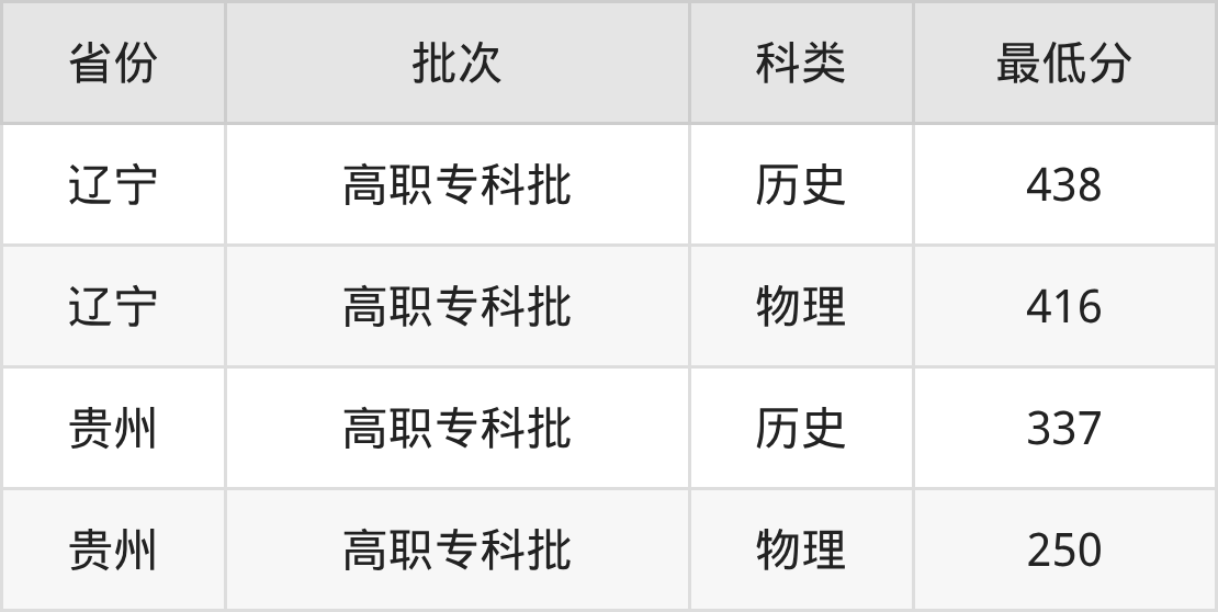 沈阳职业技术学院大数据与会计专业在全国各省最低录取分数线为250分(贵州物理类),除此之外,在其余地区的最低分为辽宁物理类416分,以上数据均为2025年数据,供2026年高考生参考。