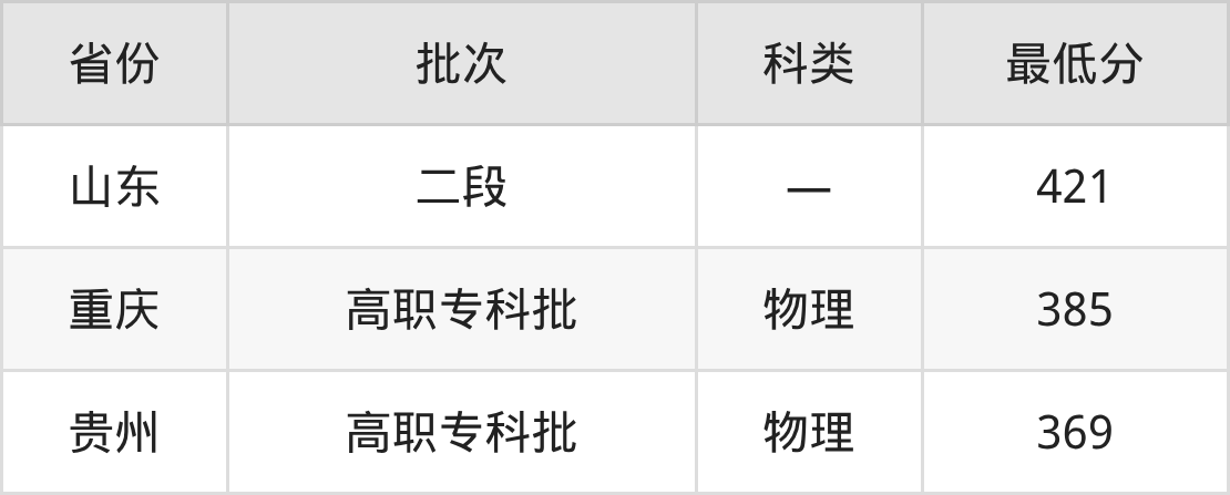 泸州职业技术学院无人机应用技术专业在全国各省最低录取分数线为369分(贵州物理类),除此之外,在其余地区的最低分为山东421分、重庆物理类385分,以上数据均为2025年数据,供2026年高考生参考。