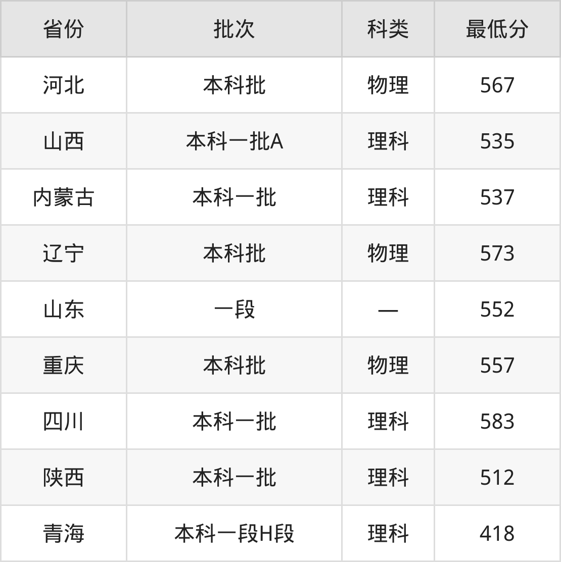 中北大学数学与应用数学专业在全国各省最低录取分数线为418分(青海理科),除此之外,在其余地区的最低分为四川理科583分、陕西理科512分、山西理科535分、辽宁物理类573分等,以上数据均为2024年数据,供2025年高考生参考。