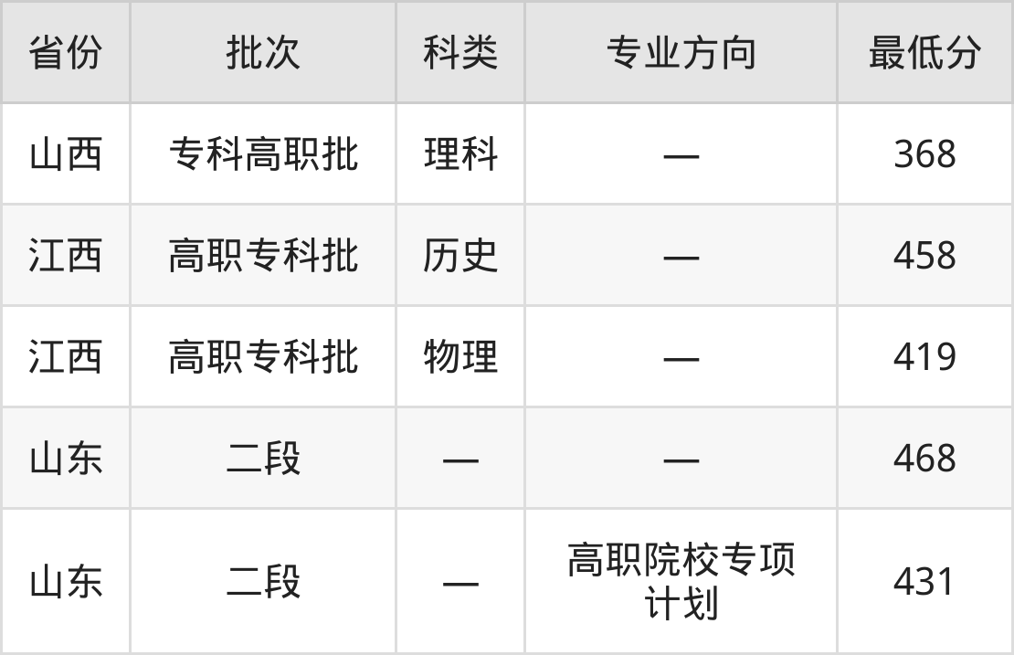 山东职业学院计算机网络技术专业录取分数线从368分到468分不等,最低分数线如下: