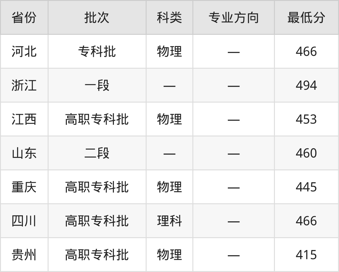 重庆电子科技职业大学自动化类专业在全国各省最低录取分数线为415分(贵州物理类),除此之外,在其余地区的最低分为山东460分、重庆物理类445分、四川理科466分、河北物理类466分等,以上数据均为2024年数据,供2025年高考生参考。