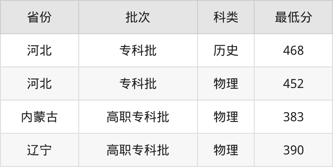 河北机电职业技术学院电气自动化技术专业录取分数线从383分到468分不等,最低分数线如下: