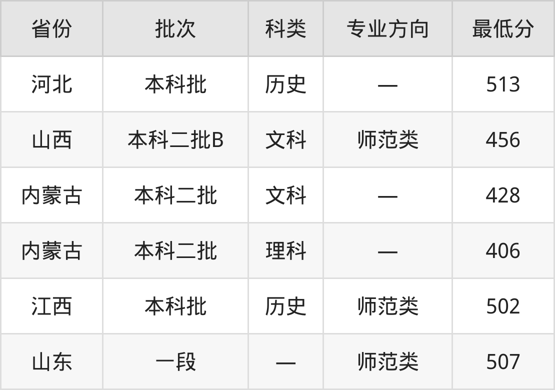 呼伦贝尔学院地理科学专业录取分数线从406分到513分不等,最低分数线如下:
