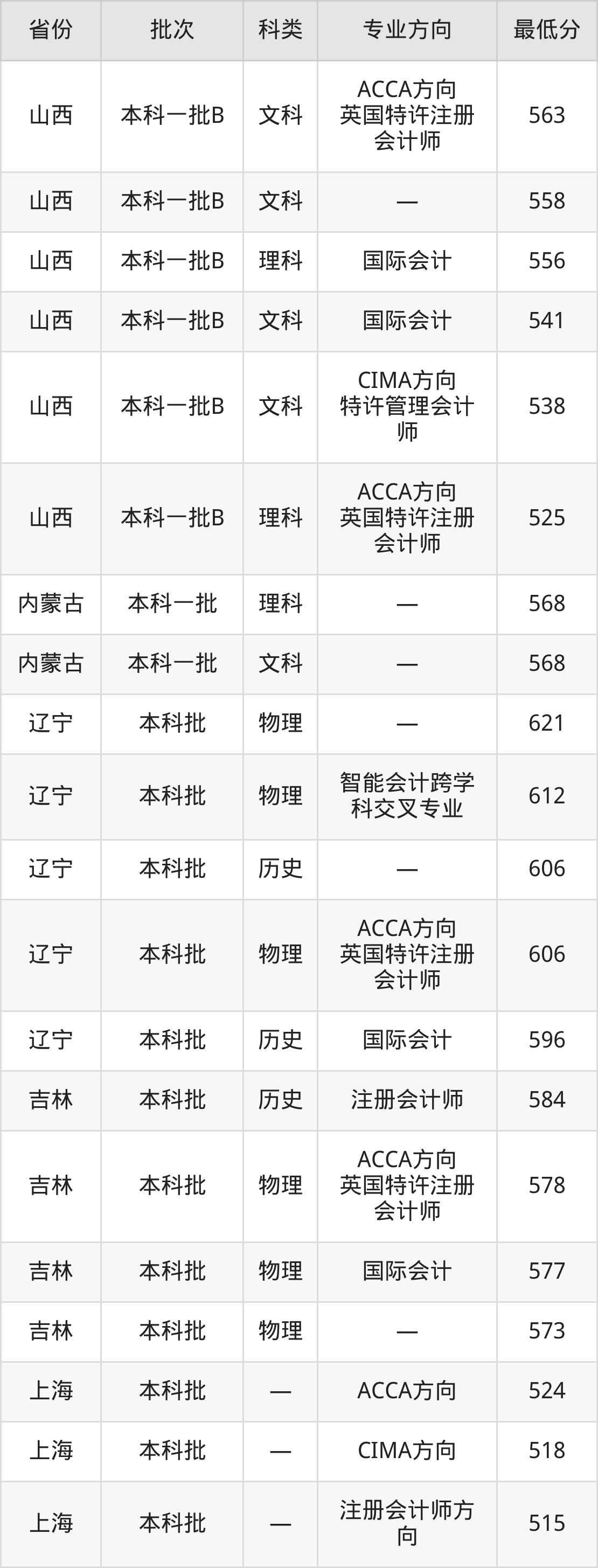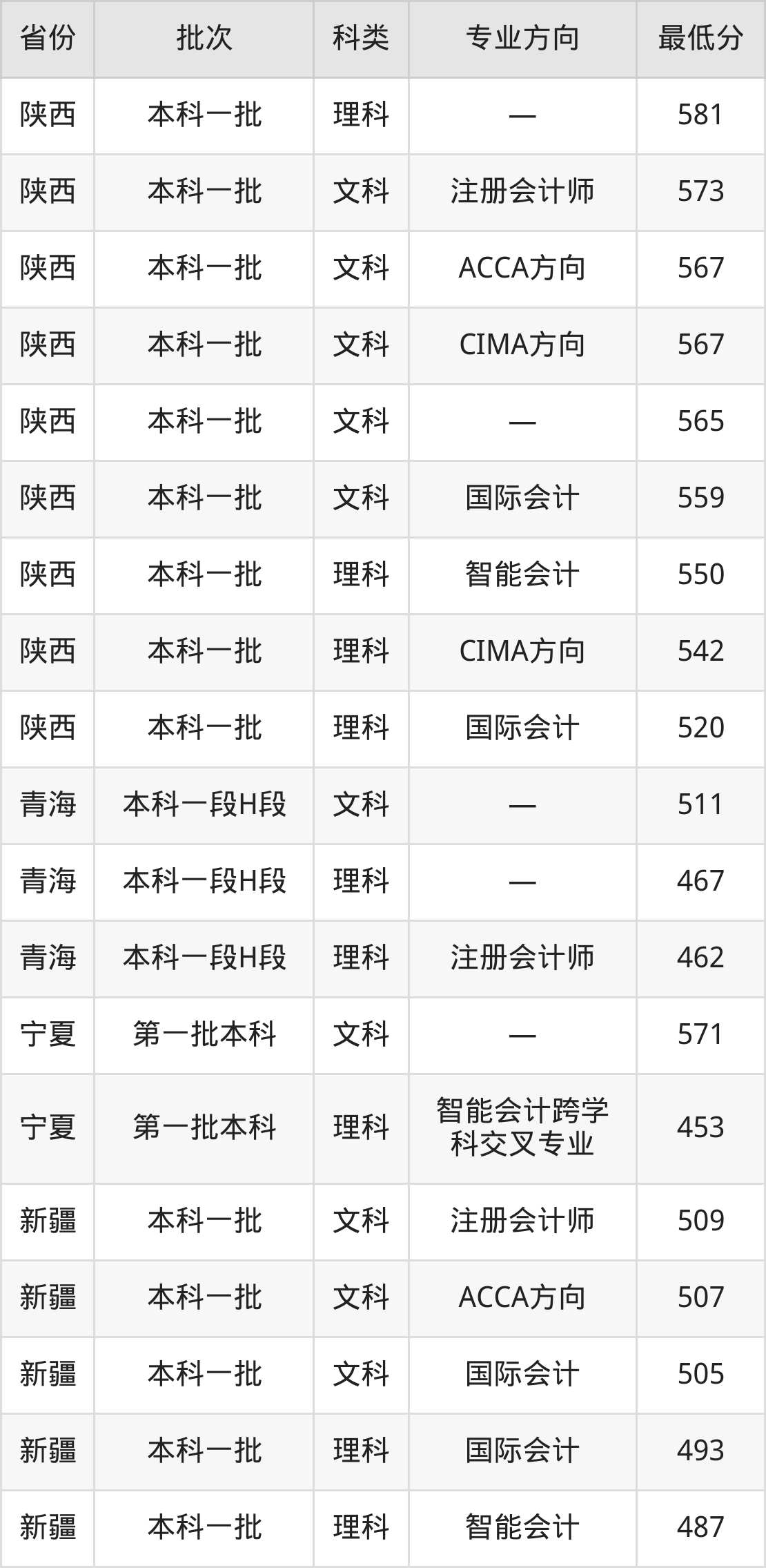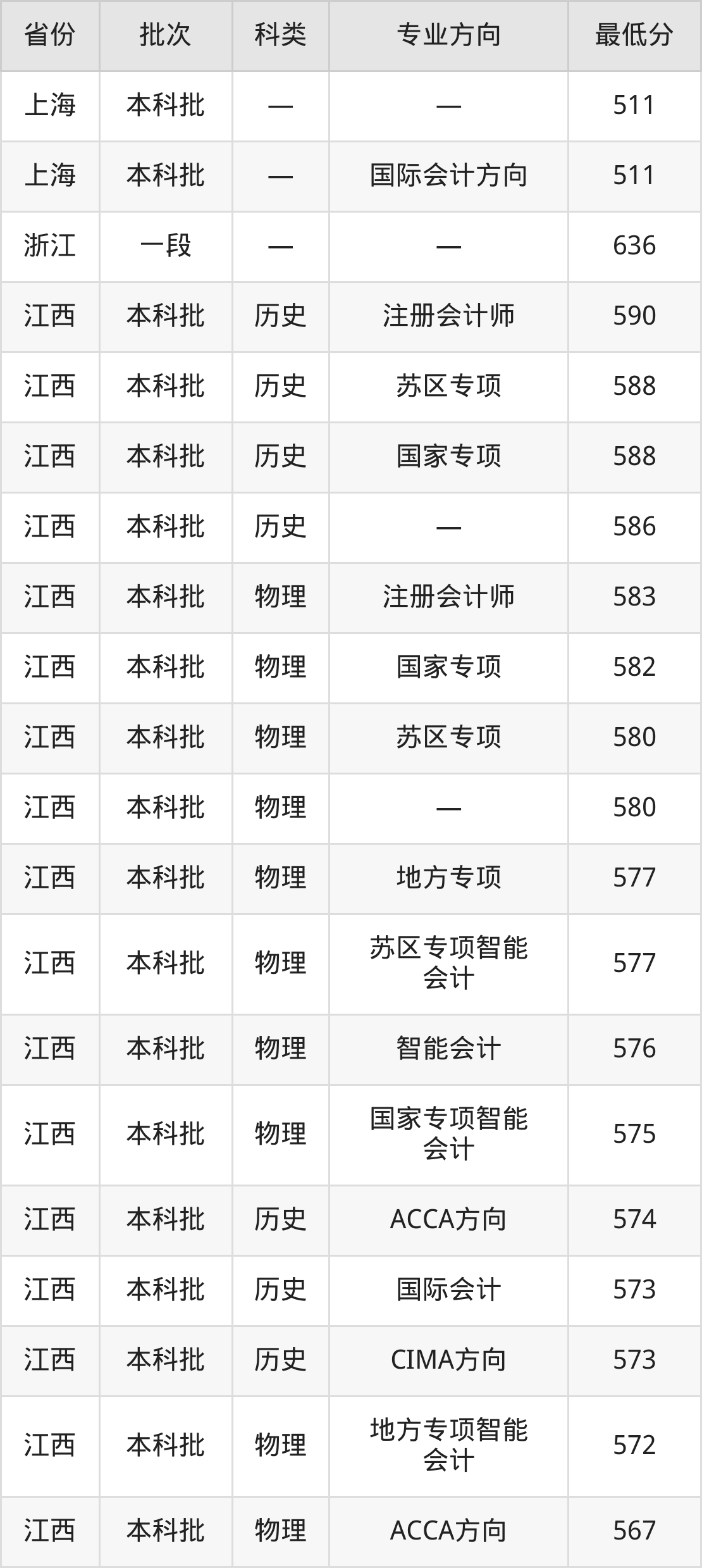 江西财经大学会计学专业录取分数线从453分到647分不等,在部分地区的最低分数线如下: