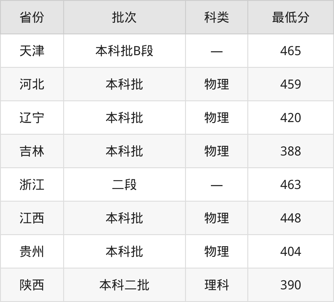 长春财经学院物联网工程专业在全国各省最低录取分数线为388分(吉林物理类),除此之外,在其余地区的最低分为陕西理科390分、天津465分、河北物理类459分、辽宁物理类420分等,以上数据均为2024年数据,供2025年高考生参考。
