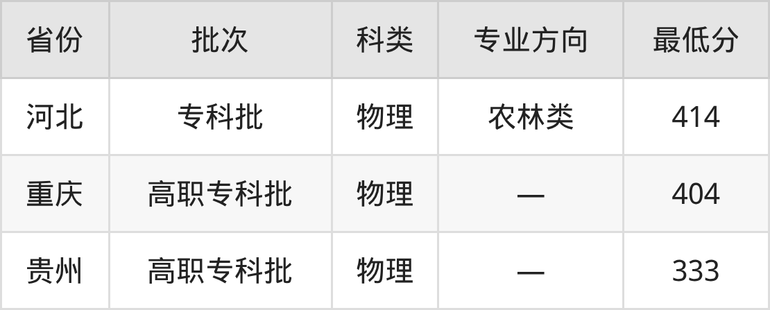 恩施职业技术学院畜牧兽医专业在全国各省录取分数线: