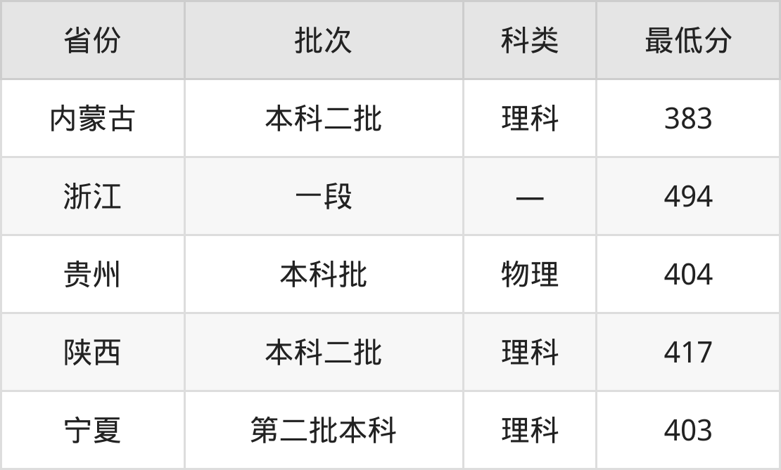 西安科技大学高新学院机械设计制造及其自动化专业在全国各省最低录取分数线为383分(内蒙古理科),除此之外,在其余地区的最低分为浙江494分、贵州物理类404分、陕西理科417分、宁夏理科403分,以上数据均为2024年数据,供2025年高考生参考。