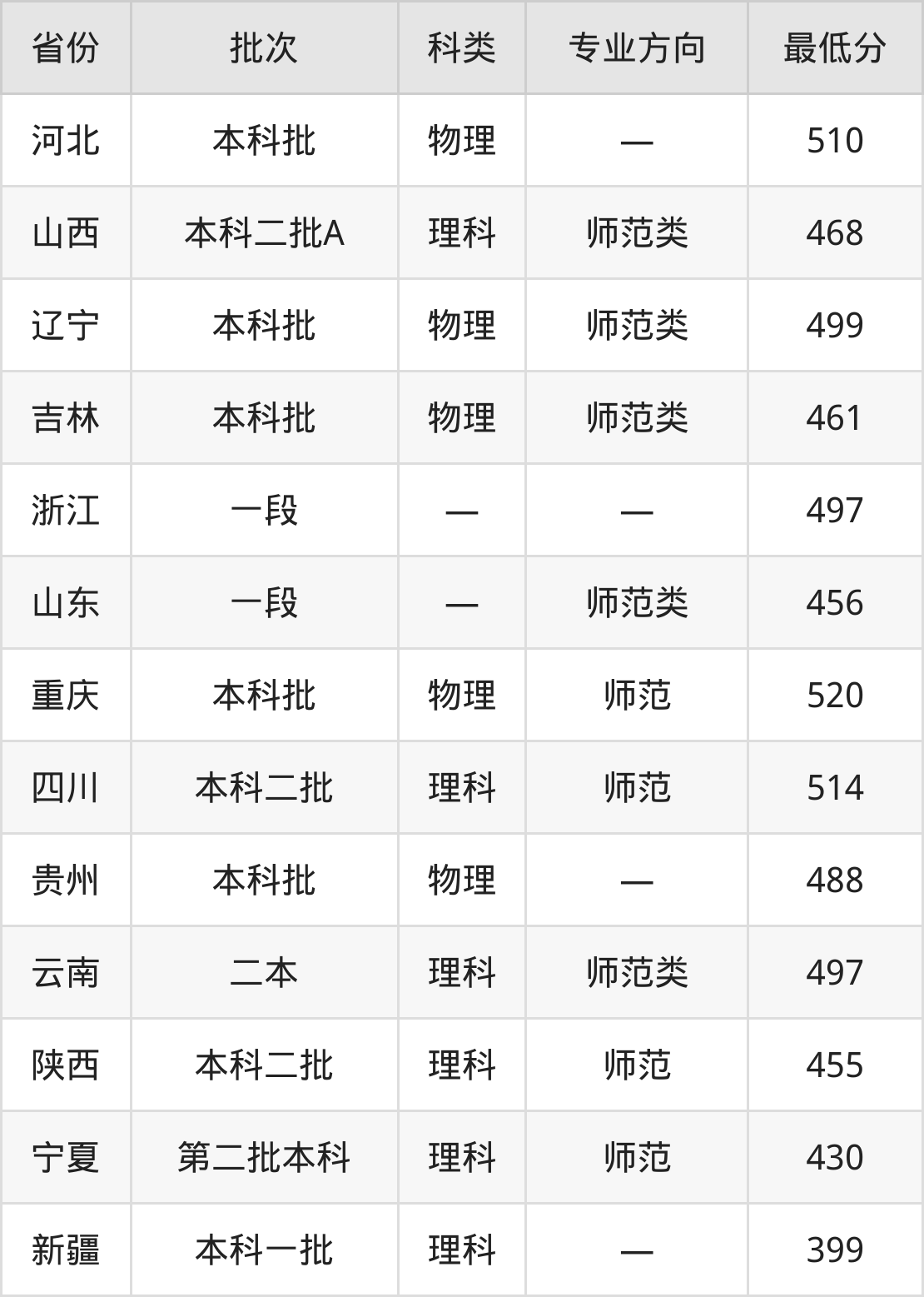 新疆师范大学生物科学专业录取分数线从399分到520分不等,在部分地区的最低分数线如下: