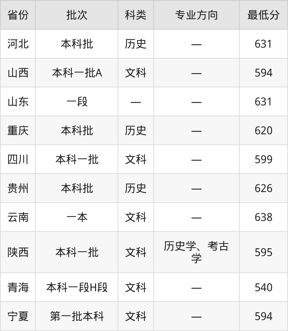 四川大学历史学类专业在全国各省最低录取分数线为540分(青海文科),除此之外,在其余地区的最低分为陕西文科595分、宁夏文科594分、山西文科594分、山东631分等,以上数据均为2024年数据,供2025年高考生参考。