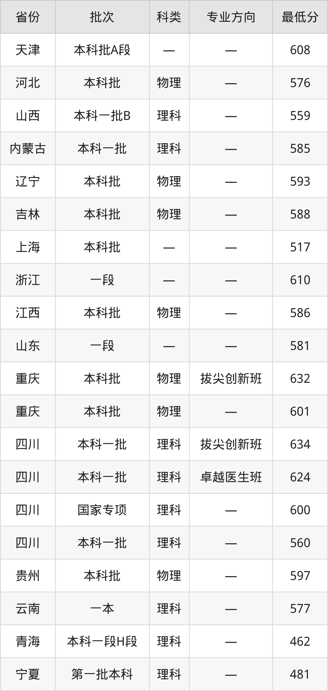 西南医科大学临床医学专业录取分数线从462分到634分不等,在部分地区的最低分数线如下: