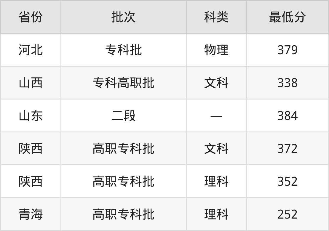 陕西国际商贸学院康复治疗技术专业录取分数线从252分到384分不等,最低分数线如下: