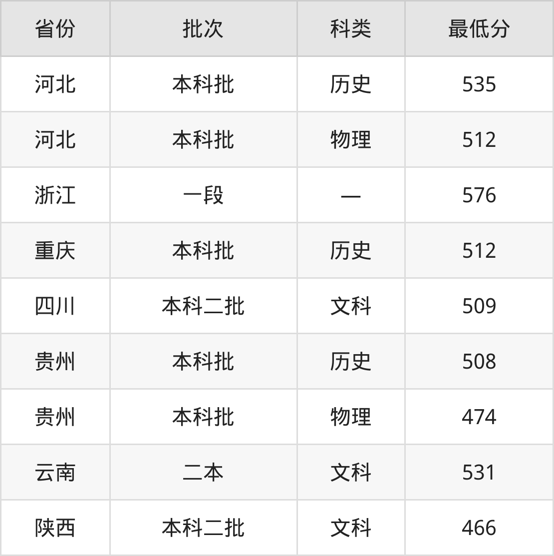 浙江万里学院法学专业录取分数线从466分到576分不等,最低分数线如下: