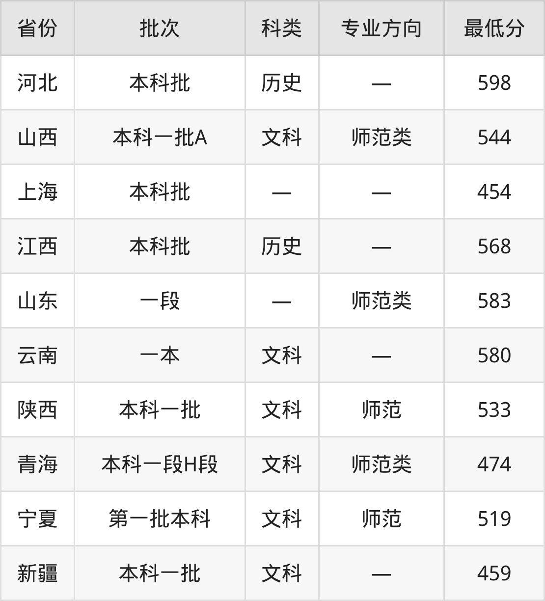 石河子大学汉语言文学专业录取分数线从454分到598分不等,最低分数线如下: