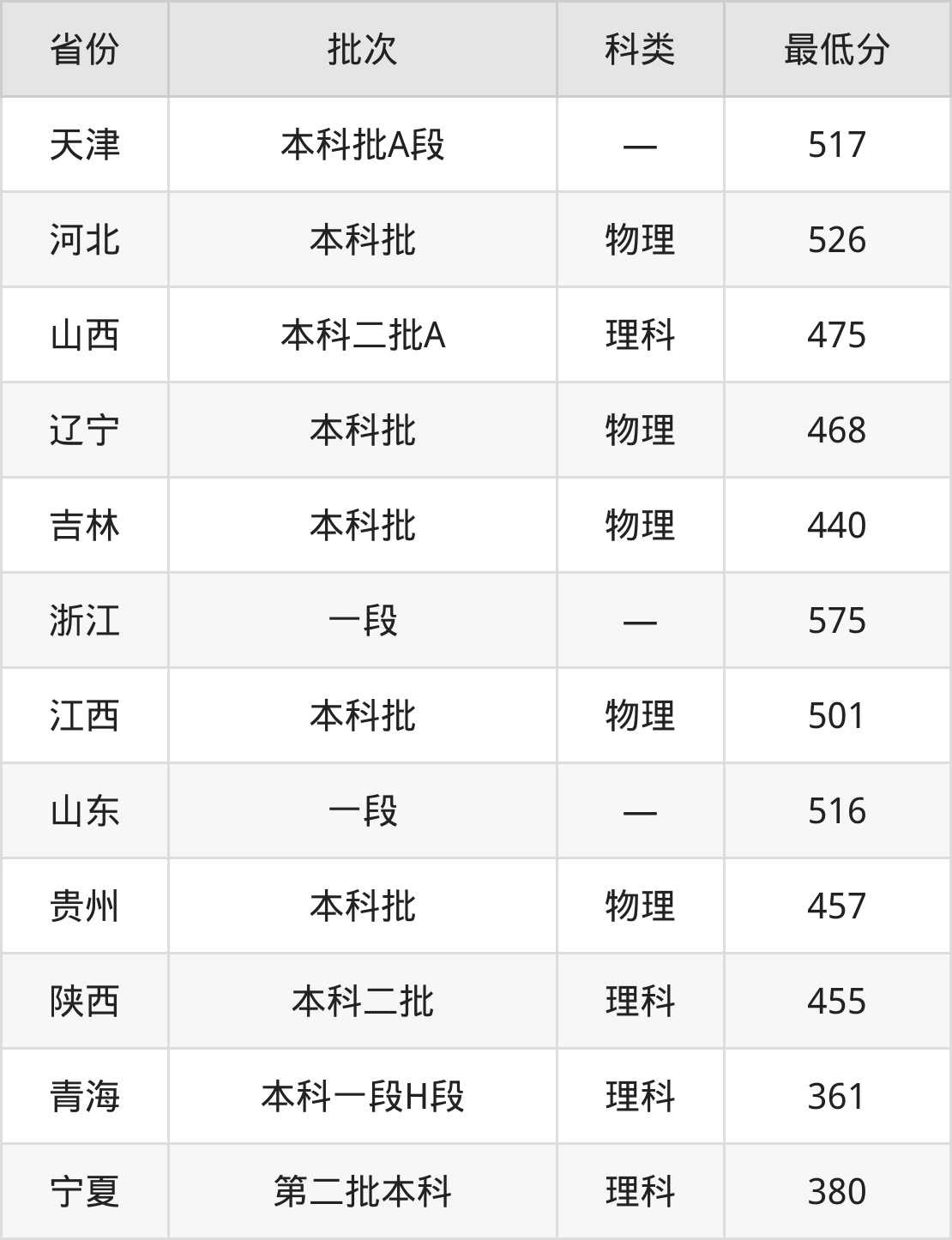 吉林建筑大学城乡规划专业在全国各省最低录取分数线为361分(青海理科),除此之外,在其余地区的最低分为贵州物理类457分、陕西理科455分、天津517分、河北物理类526分等,以上数据均为2024年数据,供2025年高考生参考。