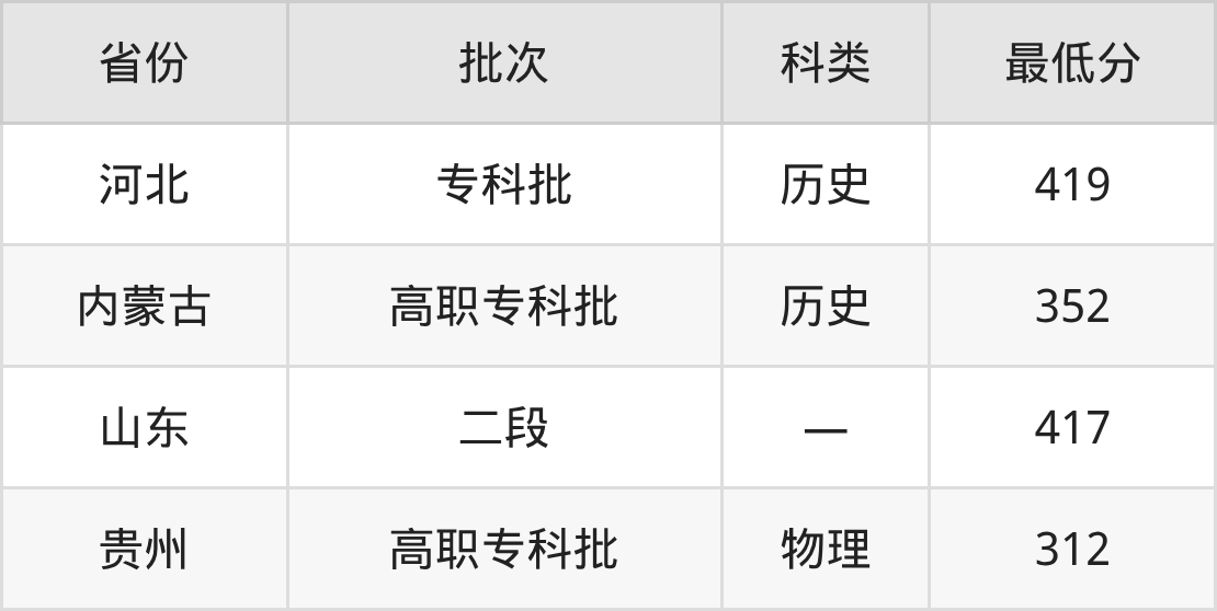 江汉艺术职业学院软件技术专业在全国各省最低录取分数线为312分(贵州物理类),除此之外,在其余地区的最低分为河北历史类419分、内蒙古历史类352分、山东417分,以上数据均为2025年数据,供2026年高考生参考。