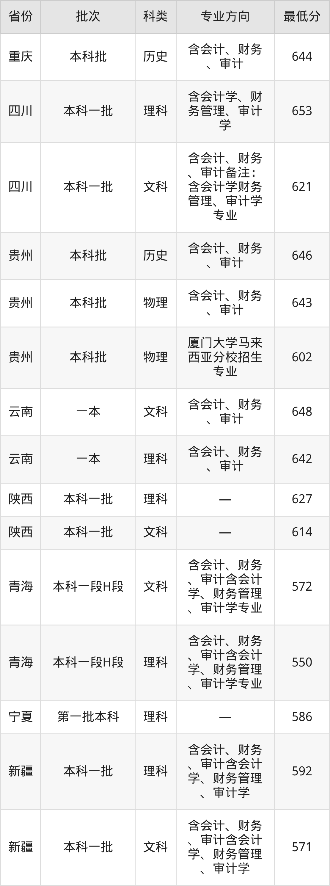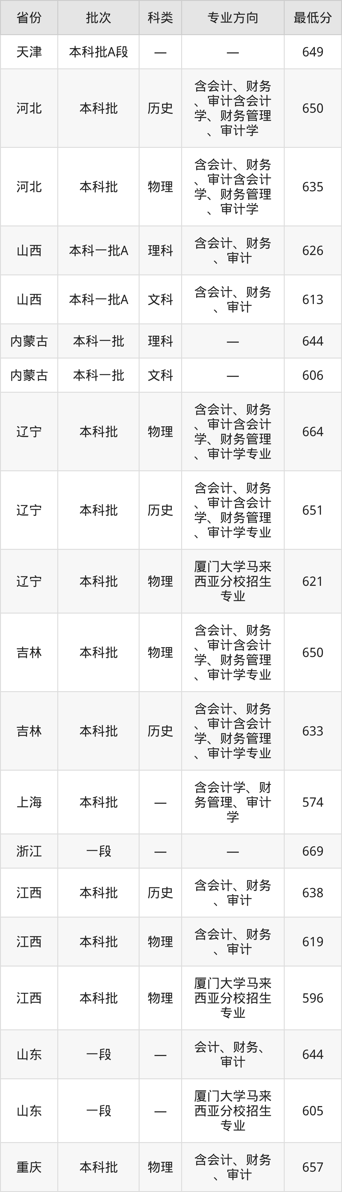 厦门大学会计学专业录取分数线从550分到669分不等,在部分地区的最低分数线如下: