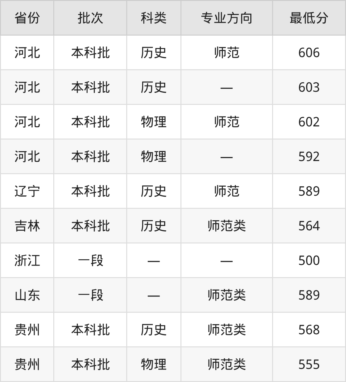 天津师范大学英语专业在全国各省最低录取分数线为500分(浙江),除此之外,在其余地区的最低分为贵州物理类555分、河北物理类592分、辽宁历史类589分、吉林历史类564分等,以上数据均为2025年数据,供2026年高考生参考。