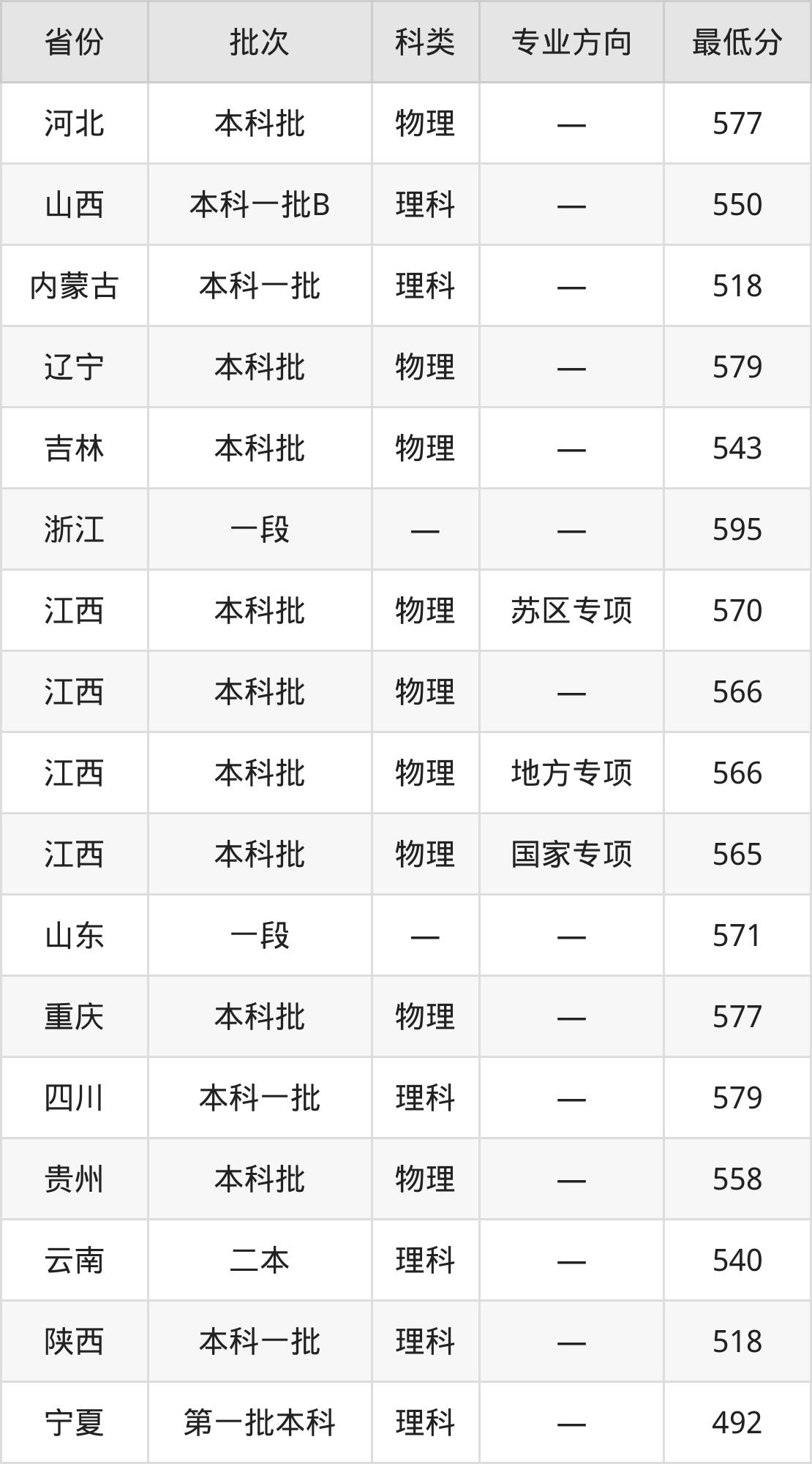 华东交通大学通信工程专业录取分数线从492分到595分不等,在部分地区的最低分数线如下: