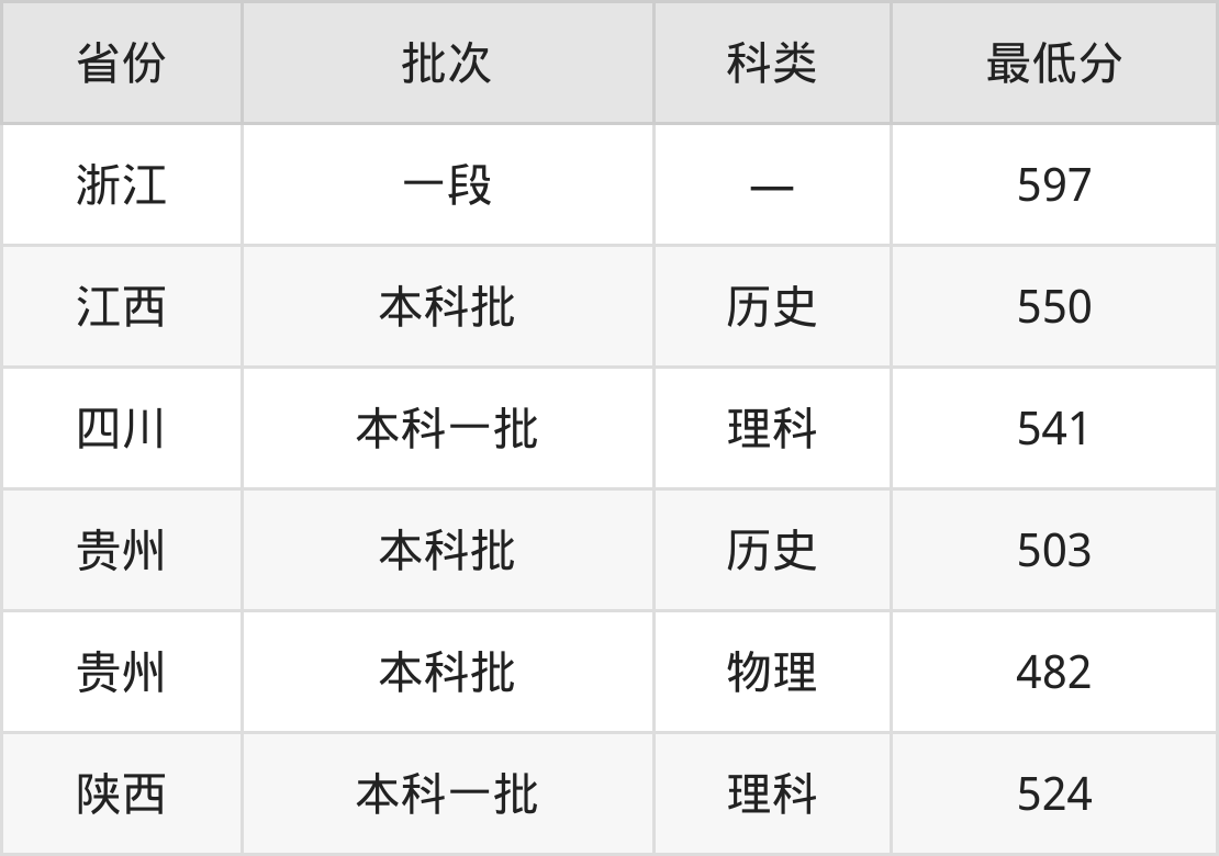 浙江中医药大学公共事业管理专业在全国各省最低录取分数线为482分(贵州物理类),除此之外,在其余地区的最低分为浙江597分、江西历史类550分、四川理科541分、陕西理科524分,以上数据均为2024年数据,供2025年高考生参考。